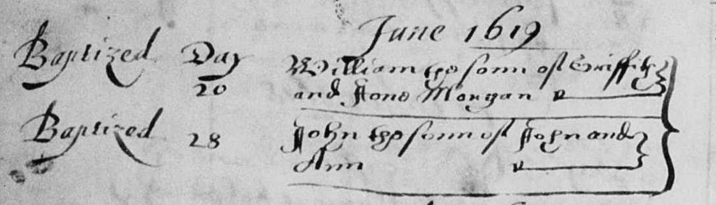 From the baptismal entries for Holy Trinity The Less parish church on Knightrider Street in London, dated 28 June 1619. The transcription of the second entry is "John bpd sonn of John and Ann." No surname is provided. There is nothing here to suggest the suname was Utie. I'm sorry to say but it's true. People make this stuff up.