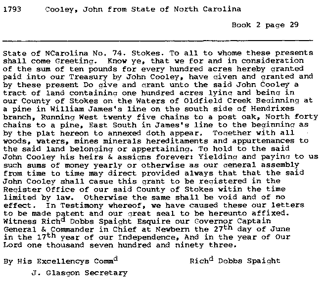 State of North Carolina to John Cooley, 1789