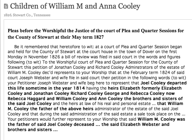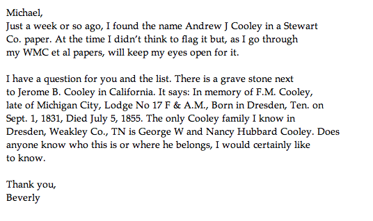 - [Fwd: RE: Cooleys in early Stewart county] Michael Cooley (Sat Dec 14 2013 - 17:49:59 CST)